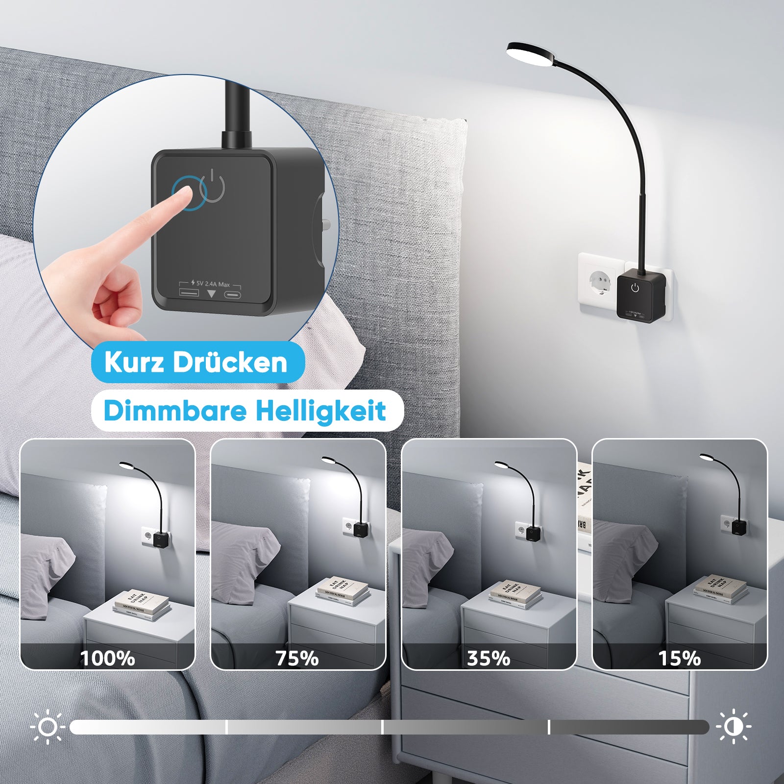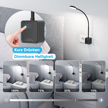 【Dimmable Brightness】Shortly press on the sensitive touch switch in the lamp base one by one can adjust the brightness of LED wall lamp. The 4 levels of lighting intensity (100%- 70%- 35%- 15%) can be adjusted in an orderly manner to meet various reading lighting requirements. Before sleeping, turning the lamp from the maximum brightness to the minimum and then turning off is more suitable for bedroom lighting