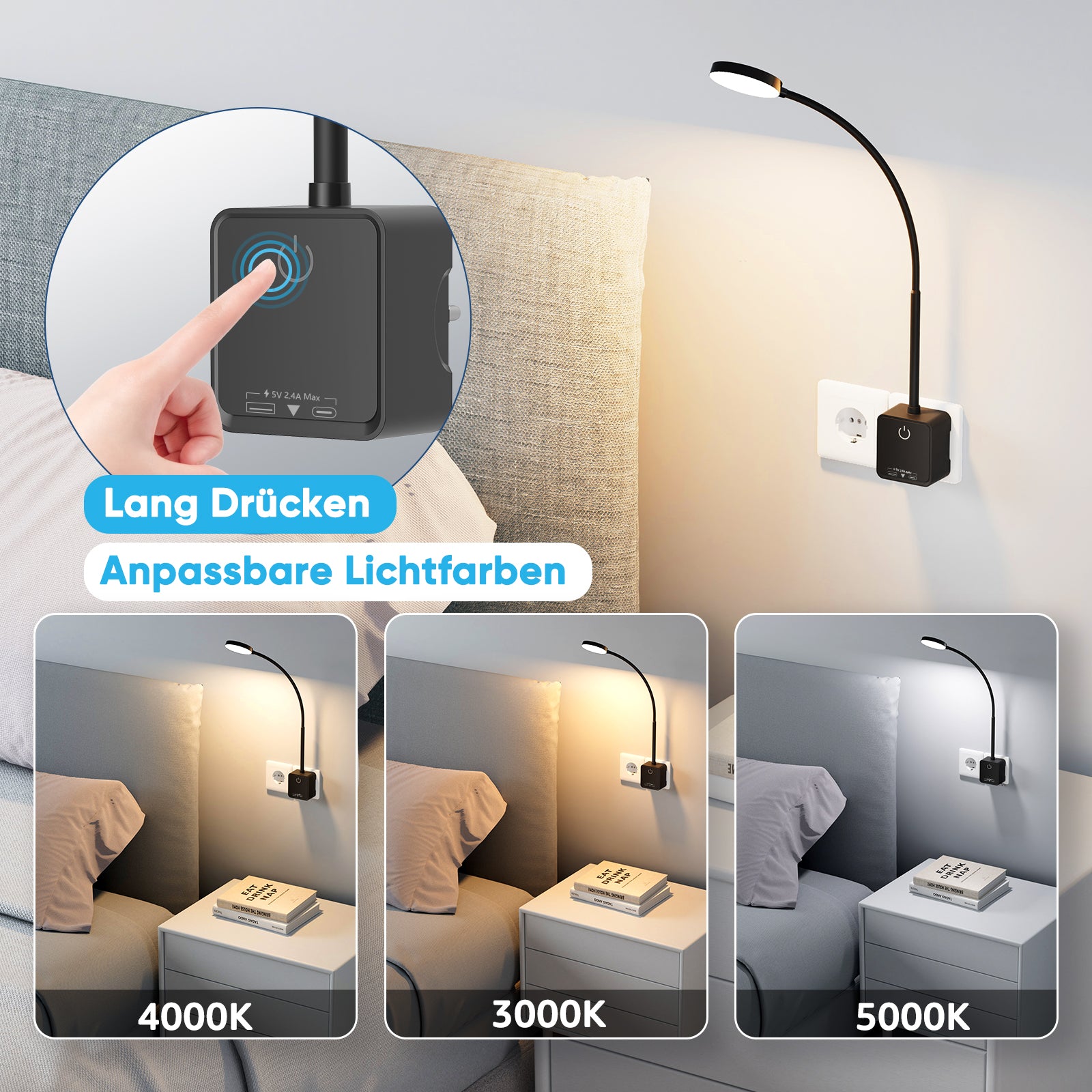 【Adjustable Lighting Colors】Longly press on the sensitive touch switch in the lamp base can adjust the lighting colors of LED wall lamp.The lighting colors can be adjusted orderly by neutral white lighting 4000K- warm white lighting 3000K- cool white lighting 5000K. 3 levels lighting color modes are suitable for different reading lighting requirements and indoor home lighting demands