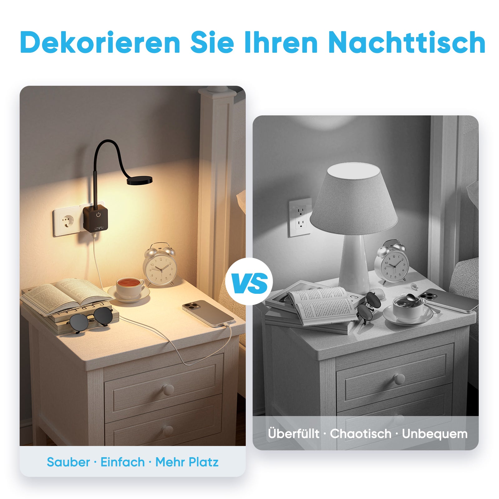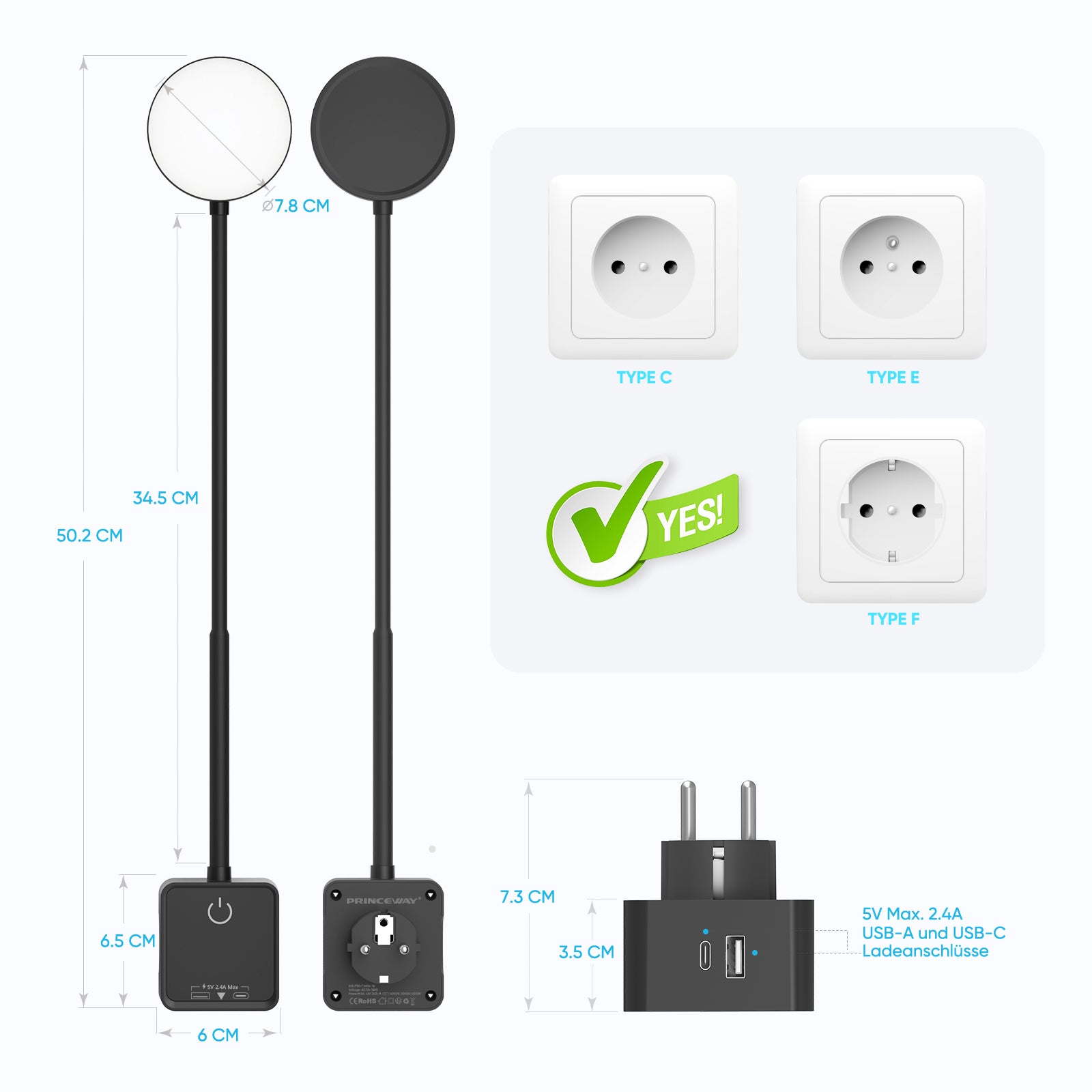 【Innovative Reading Light】The innovative design of LED reading light and standard European power plug are compactly combined together. The lamp base with power plug is compatible with all standard Type C/ Type E/ Type F power outet sockets in the wall or on the desktop. PRINCEWAY plug in reading lights can replace traditional desk lamps to save much more space on the bedside table in bedroom