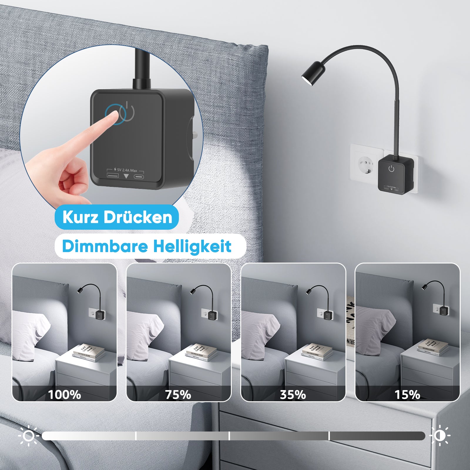 【Dimmable Brightness】Shortly press on the sensitive touch switch in the lamp base one by one can adjust the brightness of LED wall lamp. The 4 levels of lighting intensity (100%- 70%- 35%- 15%) can be adjusted in an orderly manner to meet various reading lighting requirements. Before sleeping, turning the lamp from the maximum brightness to the minimum and then turning off is more suitable bedroom lighting